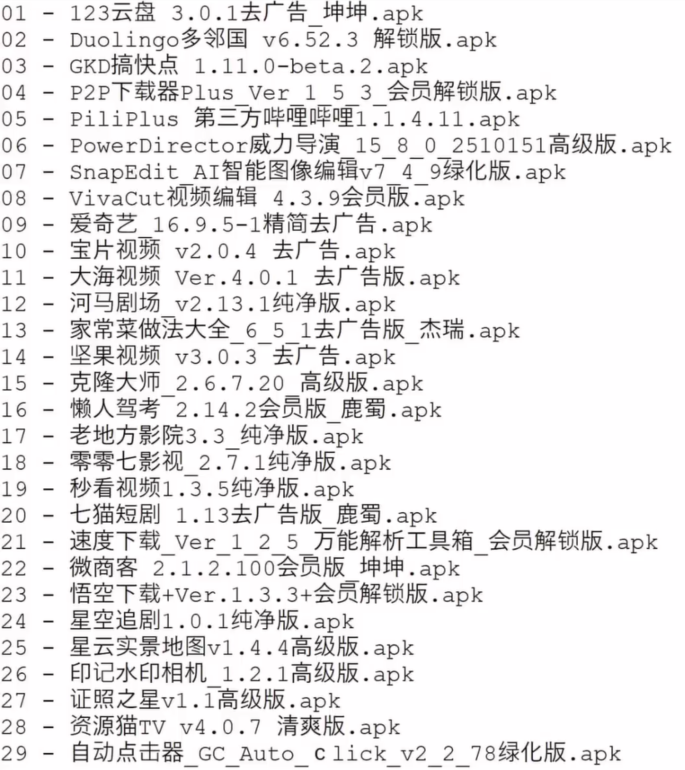描述:ps:所有软件功能自己百度了解。破解有风险,玩机需谨慎。 01 - 123云盘 3.0.1去广告_坤坤.apk 02 - Duolingo多邻国 v6.52.3 解锁版.apk 03 - GKD搞快点 1.11.0-beta.2.apk 04 - P2P下载器Plus_Ver_1_5_3_会员解锁版.apk 05 - PiliPlus 第三方哔哩哔哩1.1.4.11.apk 06 - PowerDirector威力导演_15_8_0_2510151高级版.apk 07 - SnapEdit_AI智能图像编辑v7_4_9绿化版.apk 08 - VivaCut视频编辑 4.3.9会员版.apk 09 - 爱奇艺_16.9.5-1精简去广告.apk 10 - 宝片视频 v2.0.4 去广告.apk 11 - 大海视频 Ver.4.0.1 去广告版.apk 12 - 河马剧场_v2.13.1纯净版.apk 13 - 家常菜做法大全_6_5_1去广告版_杰瑞.apk 14 - 坚果视频 v3.0.3 去广告.apk 15 - 克隆大师_2.6.7.20_高级版.apk 16 - 懒人驾考 2.14.2会员版_鹿蜀.apk 17 - 老地方影院3.3_纯净版.apk 18 - 零零七影视_2.7.1纯净版.apk 19 - 秒看视频1.3.5纯净版.apk 20 - 七猫短剧 1.13去广告版_鹿蜀.apk ..........